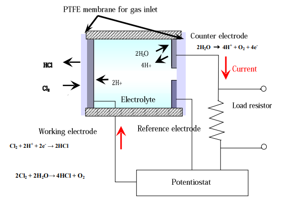電化學(xué)傳感器由氧化或還原作用的工作電極組成,還原或氧化發(fā)生時對電極和可參比電極監(jiān)視并保持電壓恒定。電化學(xué)傳感器的結(jié)構(gòu)如下圖,氯氣通過膜擴散到工作電極中,并被還原為工作電極處的氯化氫,吸附的氯在工作時接受質(zhì)子電極,然后在這個反應(yīng)中生成氯化氫水分子進(jìn)入對電極,并且在對電極處通過該系列反應(yīng)產(chǎn)生的電流而減少總計反應(yīng),如下Cl2氣體濃度與產(chǎn)生的電流成正比這一連串的反應(yīng)。